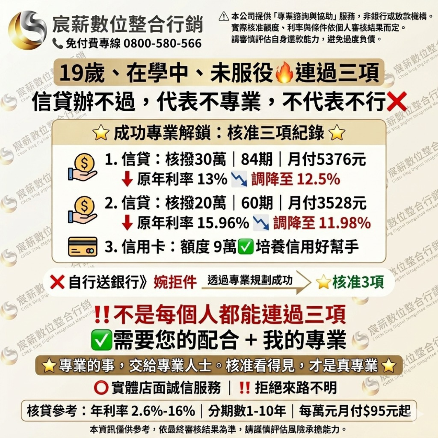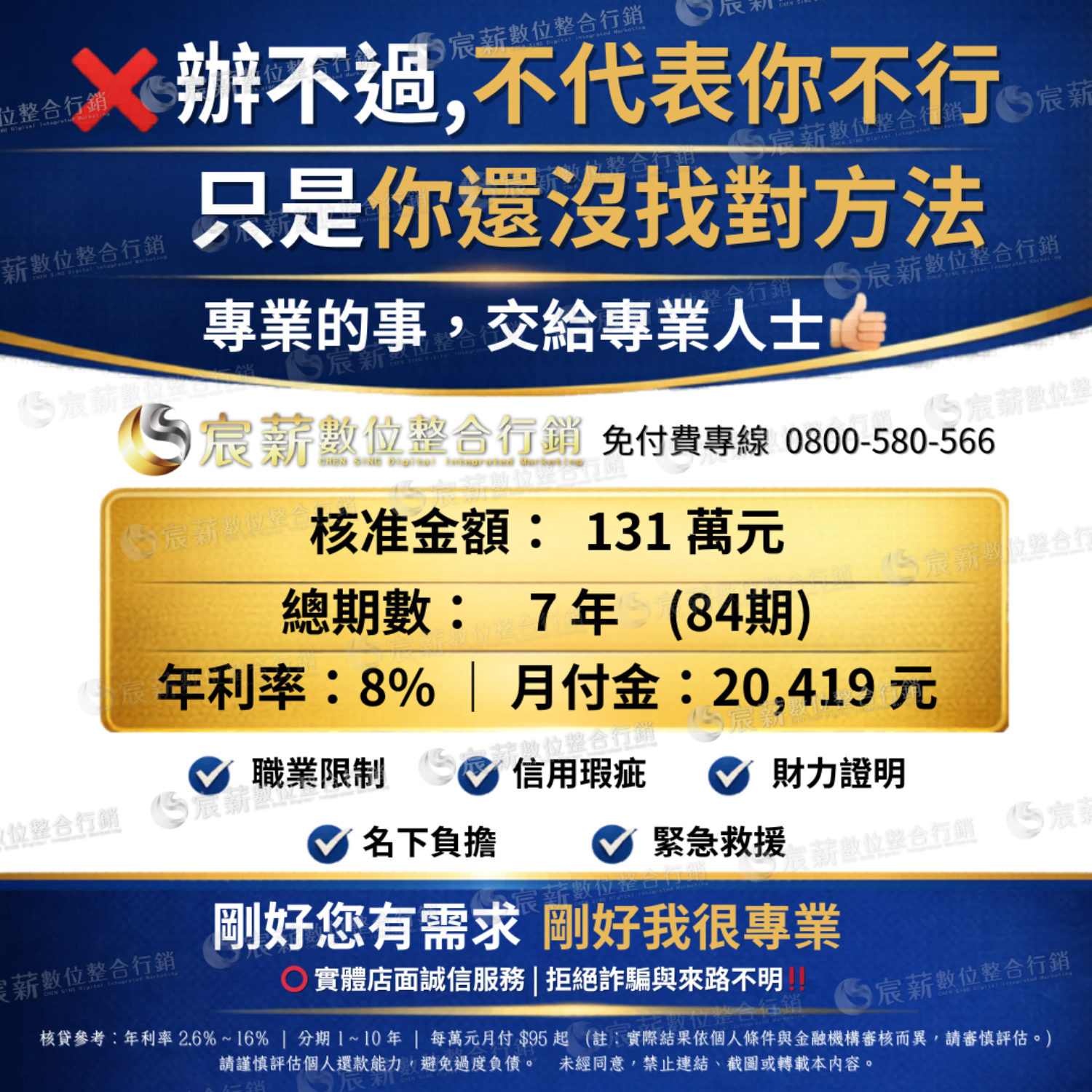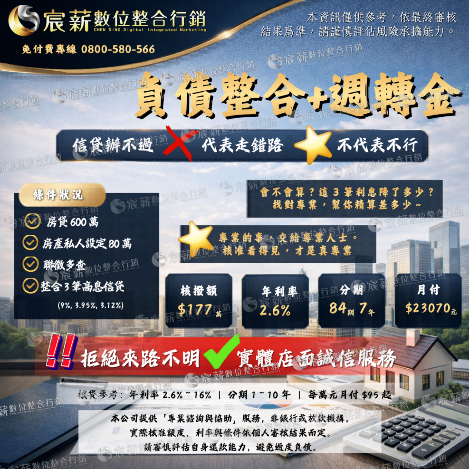 最低年利率為1.31%~16%,年限1-40年(依申貸單位規定), 以上所有貸款方案之總費用年百分率不等於貸款利率, 實際貸款條件視個別銀行貸款產品及授信條件不同而有所差異, 銀行保留核貸額度、適用利率、年限期數與核貸與否之權利,詳細約定應以銀行貸款申請書及約定書為準。